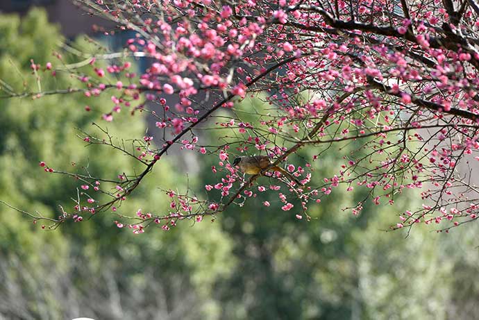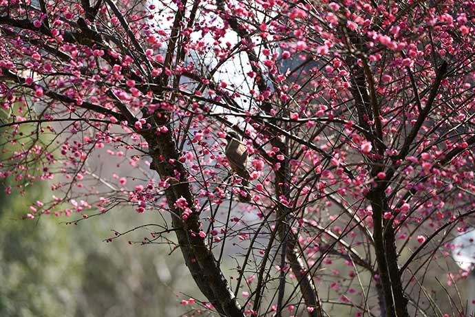 却恰在回去的路上,于路边的树上见2只鸟,好在,手中的相机早就调校好了的,光圈,焦距,乃至于ISO都是准备的非常充分的,于是抬手就拍,而且也算是恰好了,除了那鸟不够大,也不够靠近,再加上其躲在花丛中之外,其他就没啥了,给你们看看就是这样的: